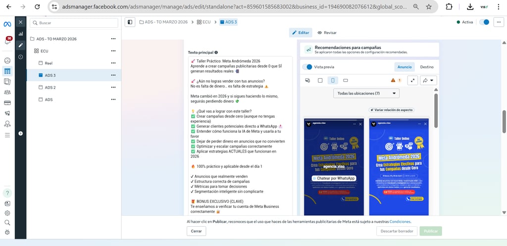 Creatividad del anuncio: La imagen o video que verá tu audiencia. En 2026, el video corto supera ampliamente a las imágenes estáticas en costo por resultado.